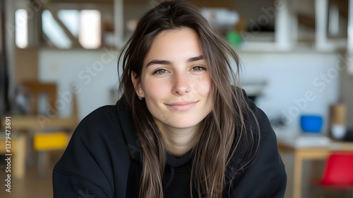 Close-up portrait of a smiling young woman with long brown hair, wearing a black hoodie, in a blurred indoor setting