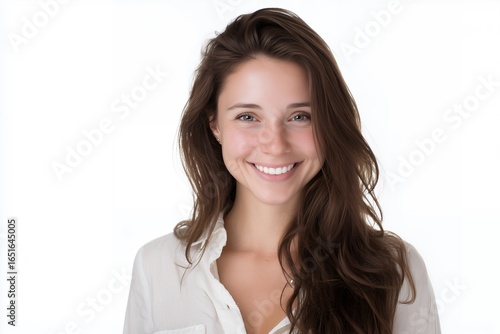 Close-up portrait of a smiling young woman with long brown hair, wearing a white shirt on a white background, concept for profile picture, social media, and online dating