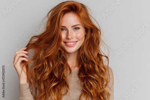 Close-up portrait of a stunning young woman with long, wavy red hair and freckles, smiling brightly and posing against a neutral background in a studio setting.