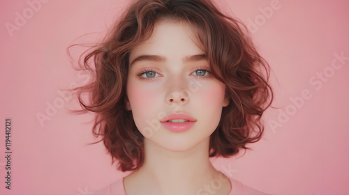 Close-up portrait of a wavy-haired girl. Pink pastel color background.