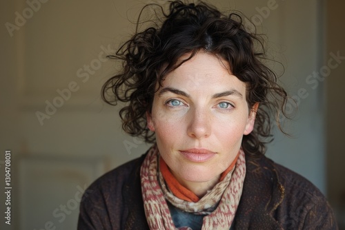 Close-Up Portrait of a Woman with Curly Hair and Bright Blue Eyes in a Soft Natural Setting
