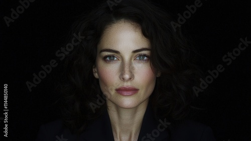 Close-up portrait of a woman with curly hair, serious expression, against a dark background.