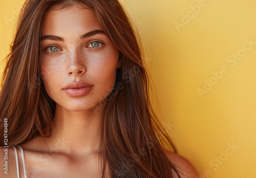 Close-up portrait of a woman with long brown hair, green eyes, glowing complexion, yellow background, natural beauty, soft lighting, modern and vibrant style