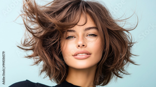 Close-up portrait of a woman with windswept short brown hair and natural makeup against a light blue background.
