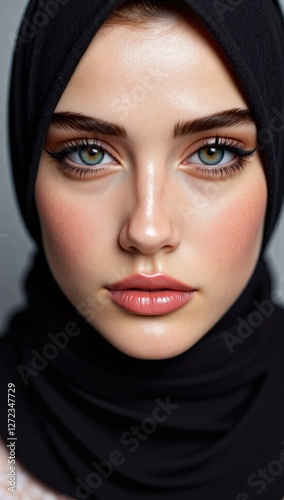 Close-up Portrait of a Young Adult Woman with Light Skin and Green Eyes Wearing a Black Hijab, Capturing a Serene Expression and Natural Makeup
