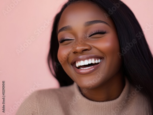 Close-Up Portrait of a Young Black Woman Laughing in Neutral Outfit