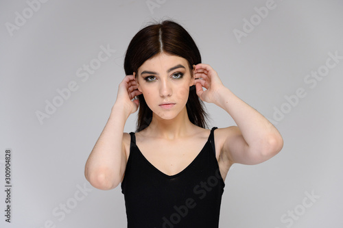 Close-up portrait of a young pretty girl student with long black hair, on a white background. He stands right in front of the camera, showing his hands in different poses with different emotions.