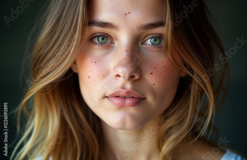 Close-up portrait of a young woman looking straight ahead. Her expression is neutral. She has light brown hair and freckles on her cheeks. The image features a focus on her facial features and skin.
