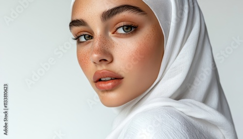 Closeup Portrait of a Young Woman Wearing a White Hijab, Elegant and Serene Beauty Shot