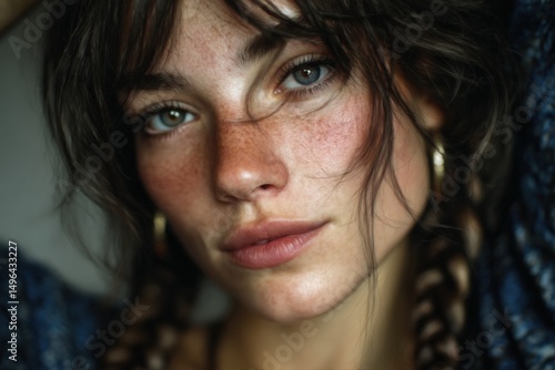 Close-up portrait of a young woman with curly hair and freckles looking at the camera