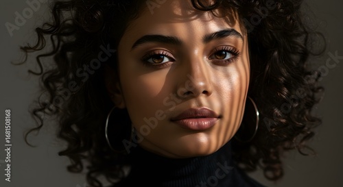 Close-up Portrait of a Young Woman with Curly Hair and Striped Shadow Detail