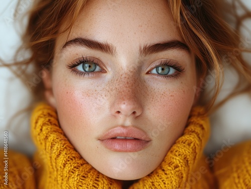Close-up portrait of a young woman with freckles and light-colored eyes, wearing a yellow knit turtleneck sweater