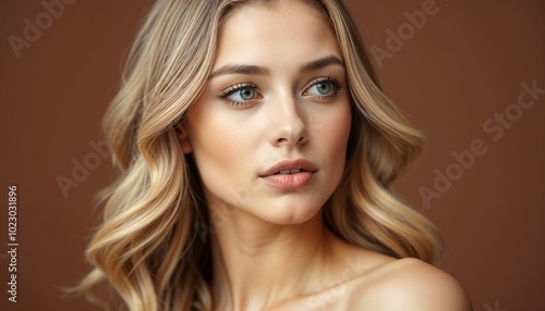 Close-up portrait of a young woman with long, soft blonde hair and calm expression, set against a warm brown background.