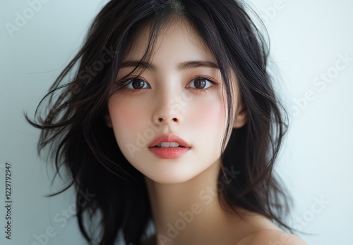 Close-up Portrait of a Young Woman with Natural Makeup and Soft Hair Against a Light Background Capturing Beauty and Elegance in a Serene Moment