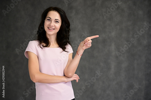 Close-up portrait of an adult pretty brunette woman in a pink t-shirt on a gray background in the studio. Beauty, Art, model posing.