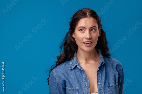 Close-up portrait of an attractive brunette girl with long curly hair posing on a blue background.