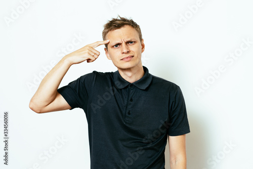 Closeup portrait of angry man gesturing with his finger against his temple, are you crazy?