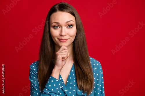 Close-up portrait of attractive brainy clever cheery brown-haired girl thinking touching chin isolated bright red color background