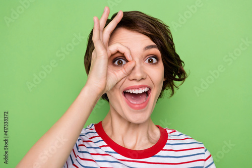 Close-up portrait of attractive cheerful girl showing ok-sign like monocle having fun isolated over green pastel color background