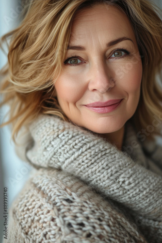 Close-up portrait of beautiful and confident middle-aged woman. Natural beauty without heavy makeup. Preservation of youth. Life style.