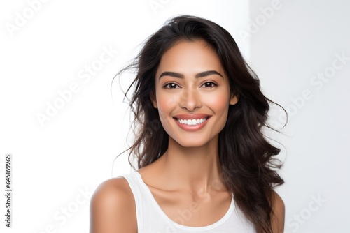 Closeup portrait of beautiful Asian Indian woman smiling with clean teeth. Used for dental advertising Isolated on white background.