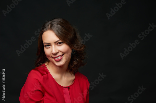 Closeup portrait of beautiful brunette woman in red shirt and wavy hair, over dark background