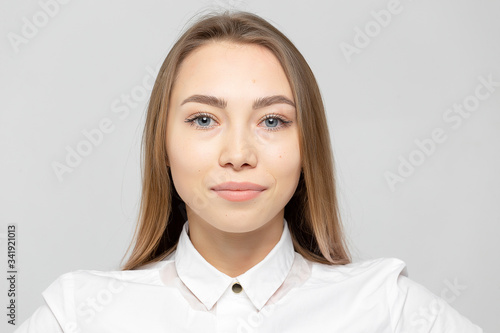 Close-up portrait of beautiful happy young attractive blonde woman in a white shirt with clean skin looking at camera against gray-white background.
