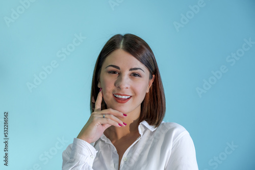 Close-up portrait of beautiful smiling caucasian woman with brown hair wearing white shirt. Blue background. Selective focus. People theme.