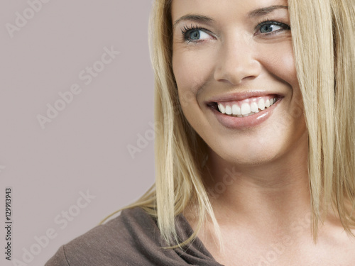Closeup portrait of beautiful young woman smiling isolated on colored background