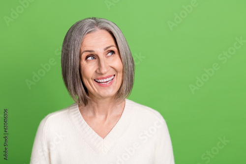 Closeup portrait of charming senior lady look interesting wonder empty space ads banner wear white shirt isolated green background