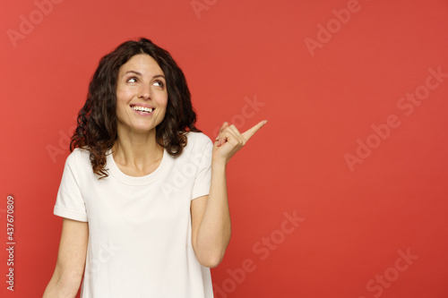 Closeup portrait of curly woman with pleasured happy smile point finger up side to copy space. Young casual female, excited caucasian girl showing direction to ads or promo on red studio background