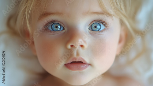 Close-up portrait of cute baby with focus on big blue clear eyes on white background
