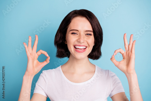 Close-up portrait of her she nice attractive cheerful cheery glad positive girl showing two ok-sign ad advert good solution isolated on bright vivid shine vibrant blue turquoise color background