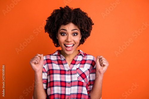 Close-up portrait of her she nice attractive lovely charming cheerful cheery wavy-haired lady wearing checked shirt celebrating winning isolated over bright vivid shine orange background