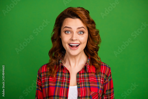 Close-up portrait of her she nice attractive lovely pretty amazed cheerful cheery wavy-haired girl wearing checked shirt great news isolated over bright vivid shine vibrant green color background