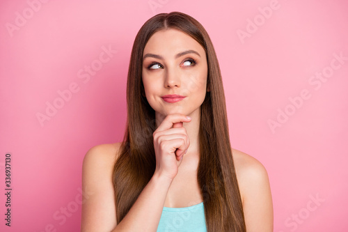 Close-up portrait of her she nice attractive lovely pretty charming cheerful cheery curious straight-haired girl creating new strategy isolated over pink pastel color background