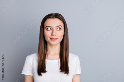 Close-up portrait of her she nice attractive lovely pretty cute dreamy curious cheery smart clever girl overthinking new plan isolated over grey pastel color background