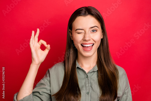 Close-up portrait of her she nice attractive lovely pretty cute glad cheerful cheery straight-haired girl showing ok-sign winking ad isolated over bright vivid shine vibrant red color background
