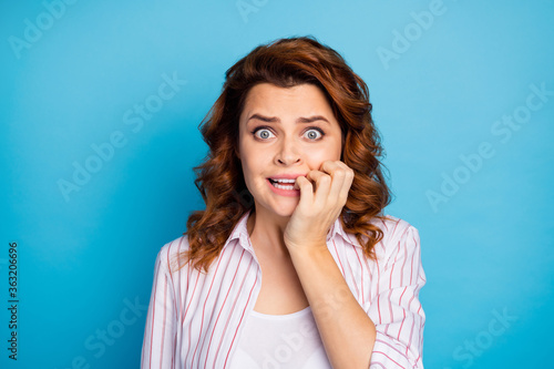 Close-up portrait of her she nice attractive lovely worried scared wavy-haired girl biting nails feeling fear isolated on bright vivid shine vibrant blue color background