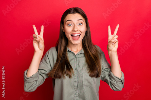 Close-up portrait of her she nice attractive positive optimistic cheerful cheery straight-haired girl showing double v-sign having fun isolated over bright vivid shine vibrant red color background