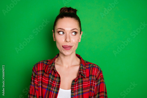 Close-up portrait of her she nice attractive pretty lovely cheery dreamy girl in checked shirt licking lip anticipating good tasty food isolated on bright vivid shine vibrant green color background
