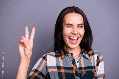Close-up portrait of her she nice lovely pretty winsome attractive cheerful cheery positive straight-haired lady wearing checked plaid showing v-sign isolated over gray pastel background