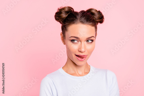 Close-up portrait of her she nice-looking lovely lovable attractive cheerful funny girl with buns licking lips isolated over pink pastel background