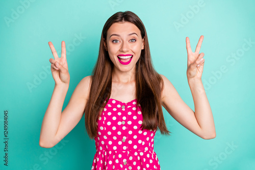 Close-up portrait of her she nice-looking lovely winsome cheerful cheery glad funny funky straight-haired girl showing v-sign isolated over green blue turquoise bright vivid shine background