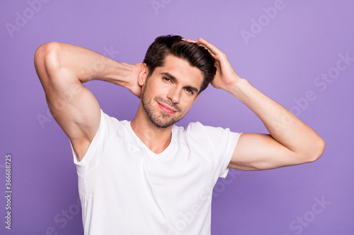 Close-up portrait of his he nice attractive well-groomed content sportive cheery brown-haired guy touching silky hair isolated over bright vivid shine vibrant lilac violet purple color background