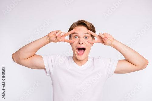 Close-up portrait of his he nice cute attractive cheerful cheery positive optimistic crazy guy showing double v-sign near eyes isolated over light white pastel background