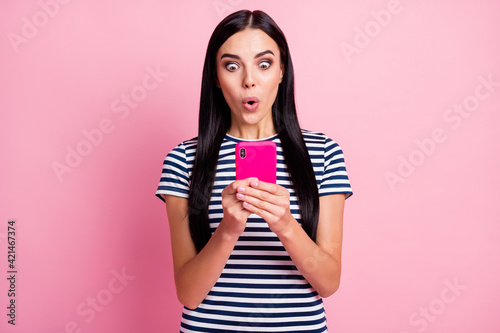 Close-up portrait of lovely amazed focused girl using gadget pouted lips browsing multimedia isolated on pink pastel color background