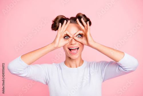 Close-up portrait of nice adorable attractive lovely sweet cheerful cheery funky positive excited glad girl showing like glasses isolated over pink pastel background