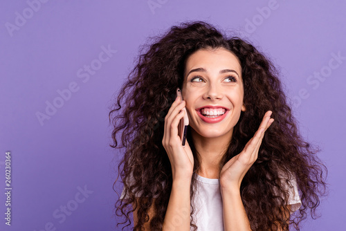 Close-up portrait of nice cute attractive sweet lovable lovely cheerful cheery wavy-haired lady discussing good news cellular connection isolated on bright vivid shine violet pastel background