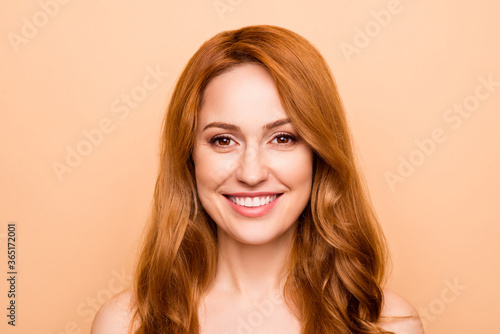 Close-up portrait of nice-looking attractive sweet lovely nude naked pure perfect cheerful wavy-haired lady after facial therapy treatment isolated over beige pastel background
